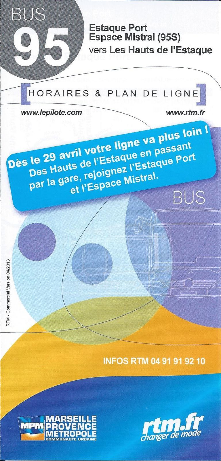 A partir de cette date, la ligne 95 de la RTM sera prolongé et desservira tout l'Estaque, des Hauts de l'Estaque en passant par la Gare et rejoindra l'Estaque Plage et l'Espace Mistral.